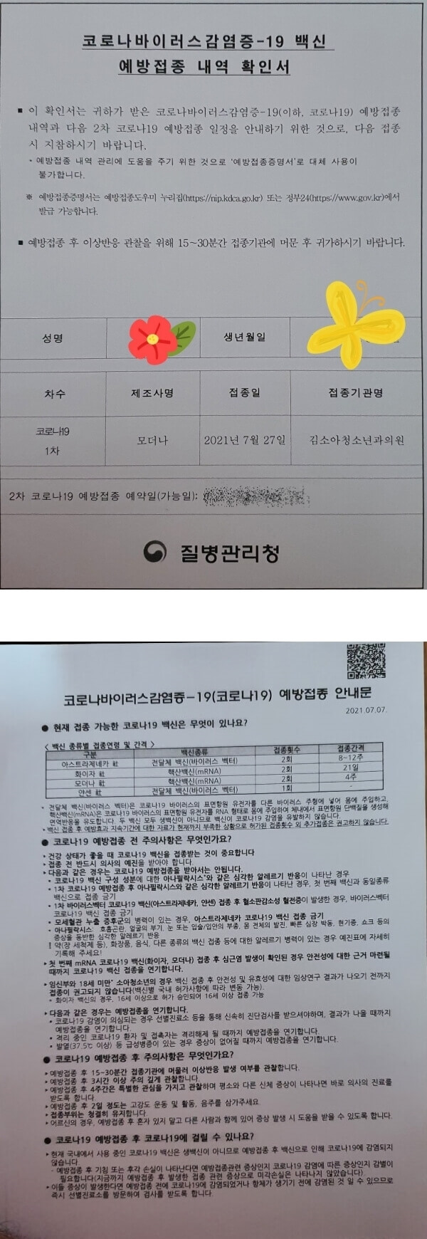 그리고는 2차 접종에 대한 안내장과 백신 접종의 주의할 점이 적혀있는 안내장을 받은 후 병원을 나왔다.