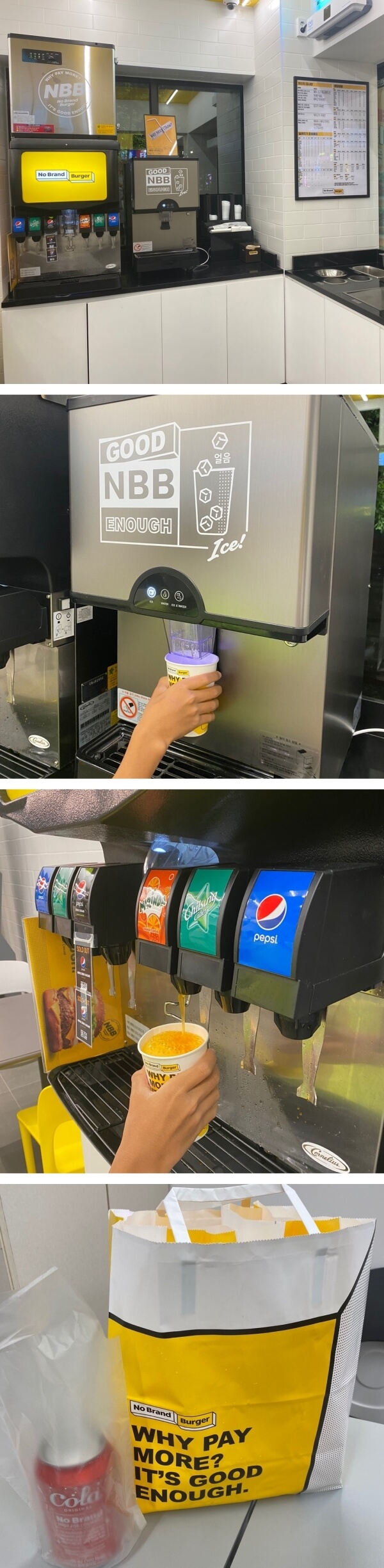 음료는 카운터에서 컵을 받은 후, 셀프 기계에서 얼음과 음료를 먹을 만큼 받으면 된다.