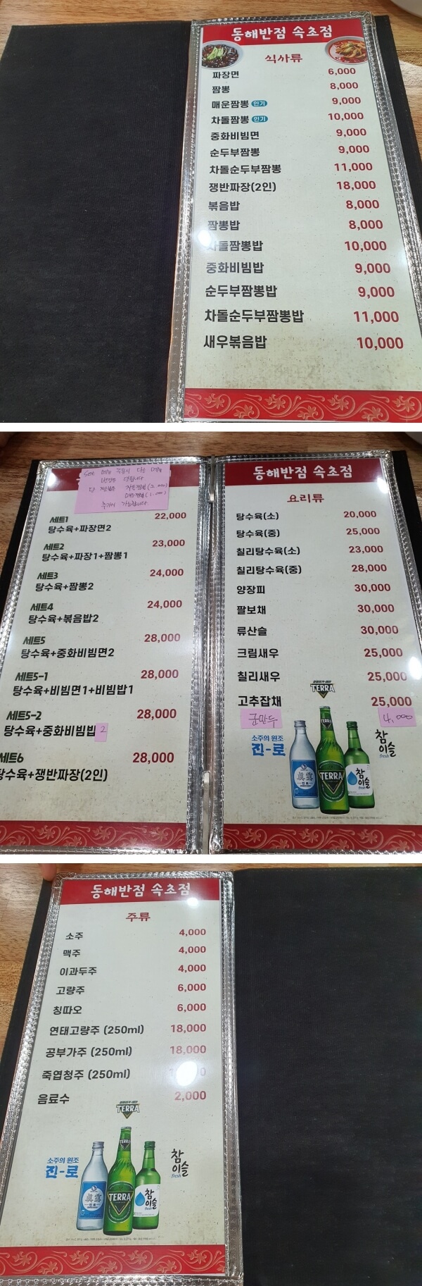 동해반점의 메뉴는 크게 식사류, 요리류, 주류로 나뉘어 있다.