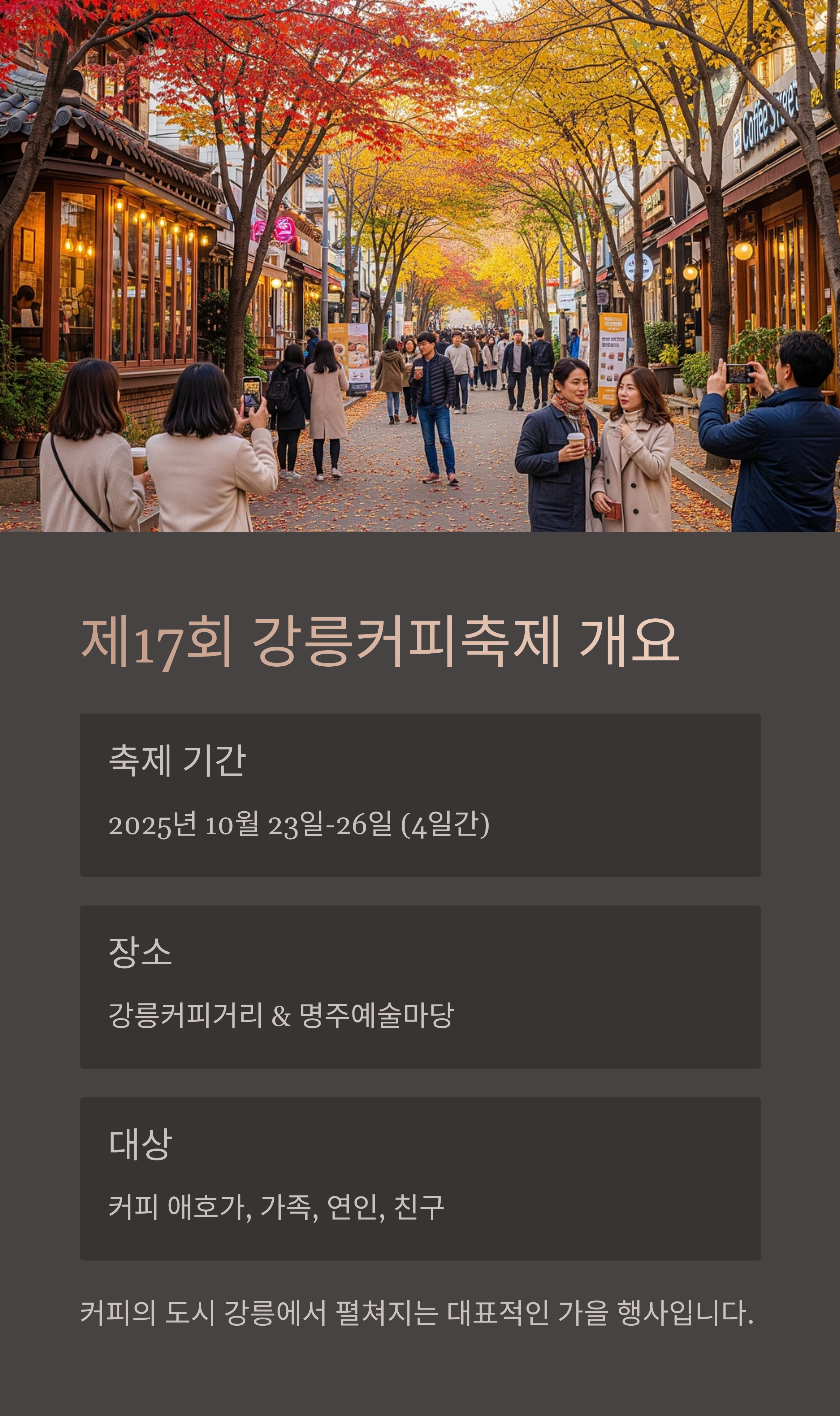 2025년 10월 23일 목요일부터 26일 일요일까지 단 4일간 진행되는 제17회 강릉커피축제는 강릉커피거리와 명주예술마당을 중심으로 진행됩니다.