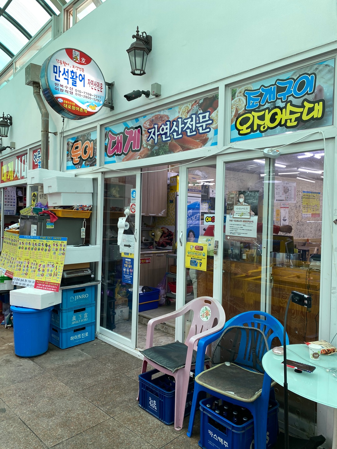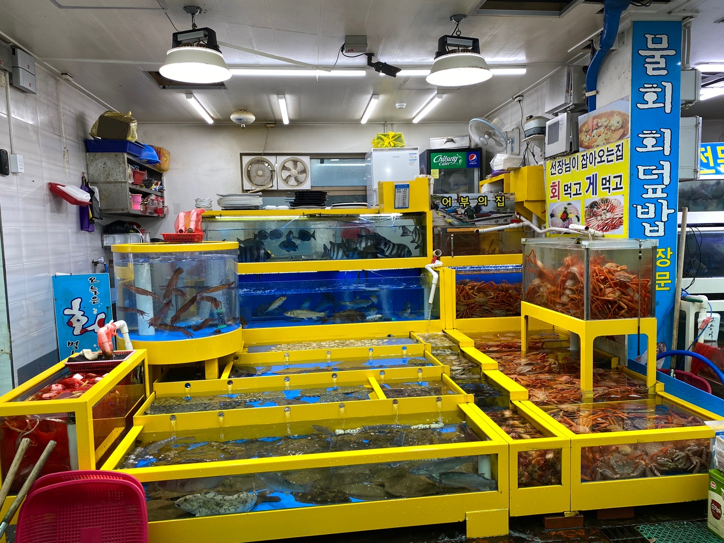대포동 수산시장 D동에 있으며 건물의 양옆으로 들어가는 입구가 두개있다.