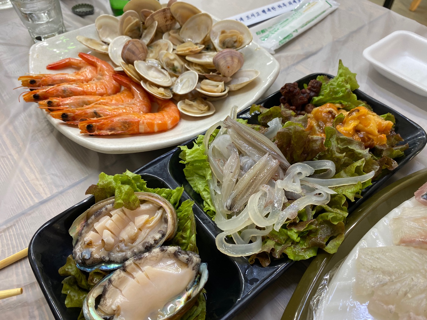 먼저 새우와 조개, 멍게, 오징어, 전복, 옥수수콘 샐러드, 고추 마늘, 상추가 나오고 조금후에 아이스판 위에 정갈하게 썰어진 활어 회가 나왔다.