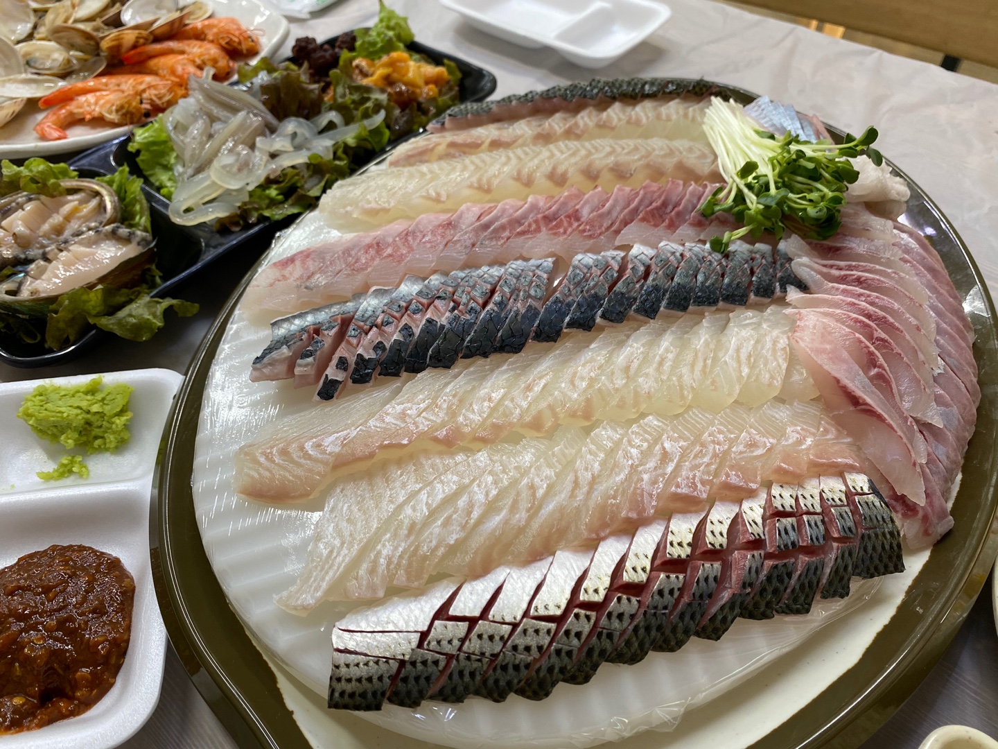 먼저 새우와 조개, 멍게, 오징어, 전복, 옥수수콘 샐러드, 고추 마늘, 상추가 나오고 조금후에 아이스판 위에 정갈하게 썰어진 활어 회가 나왔다.