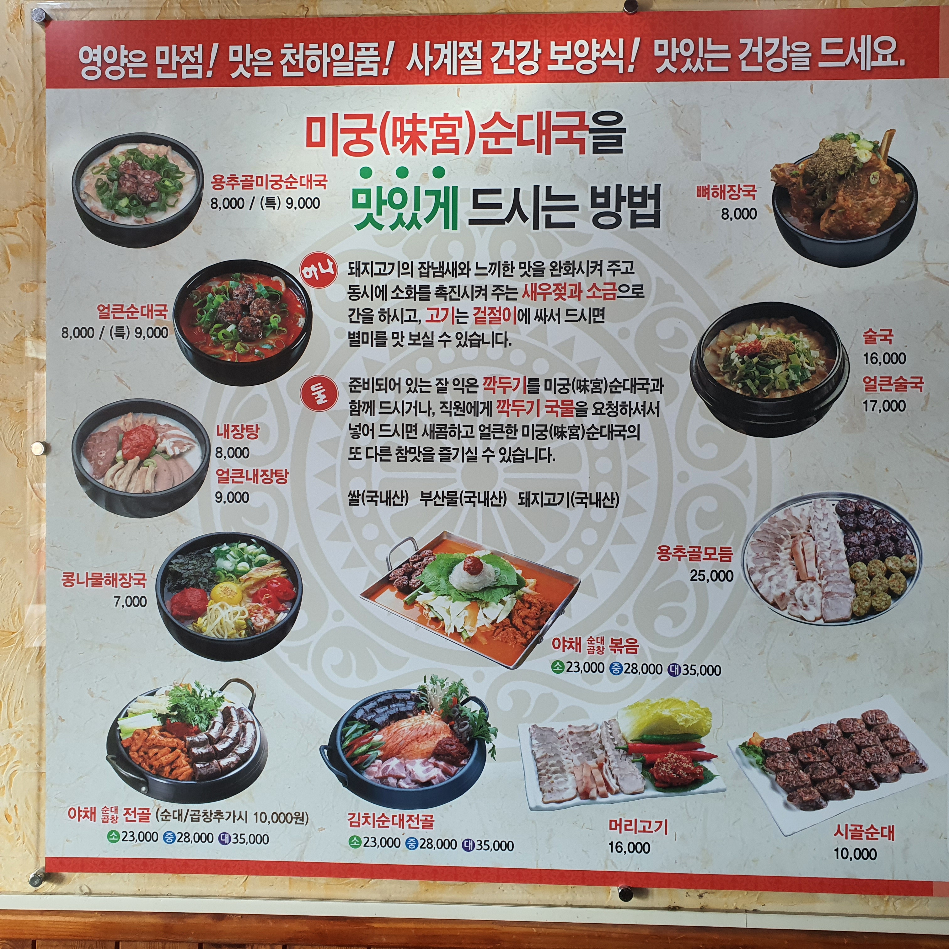 내가 먹어 본것은 순대국 종류 뿐이고 그중 에서는 얼큰 순대국을 가장 좋아한다.