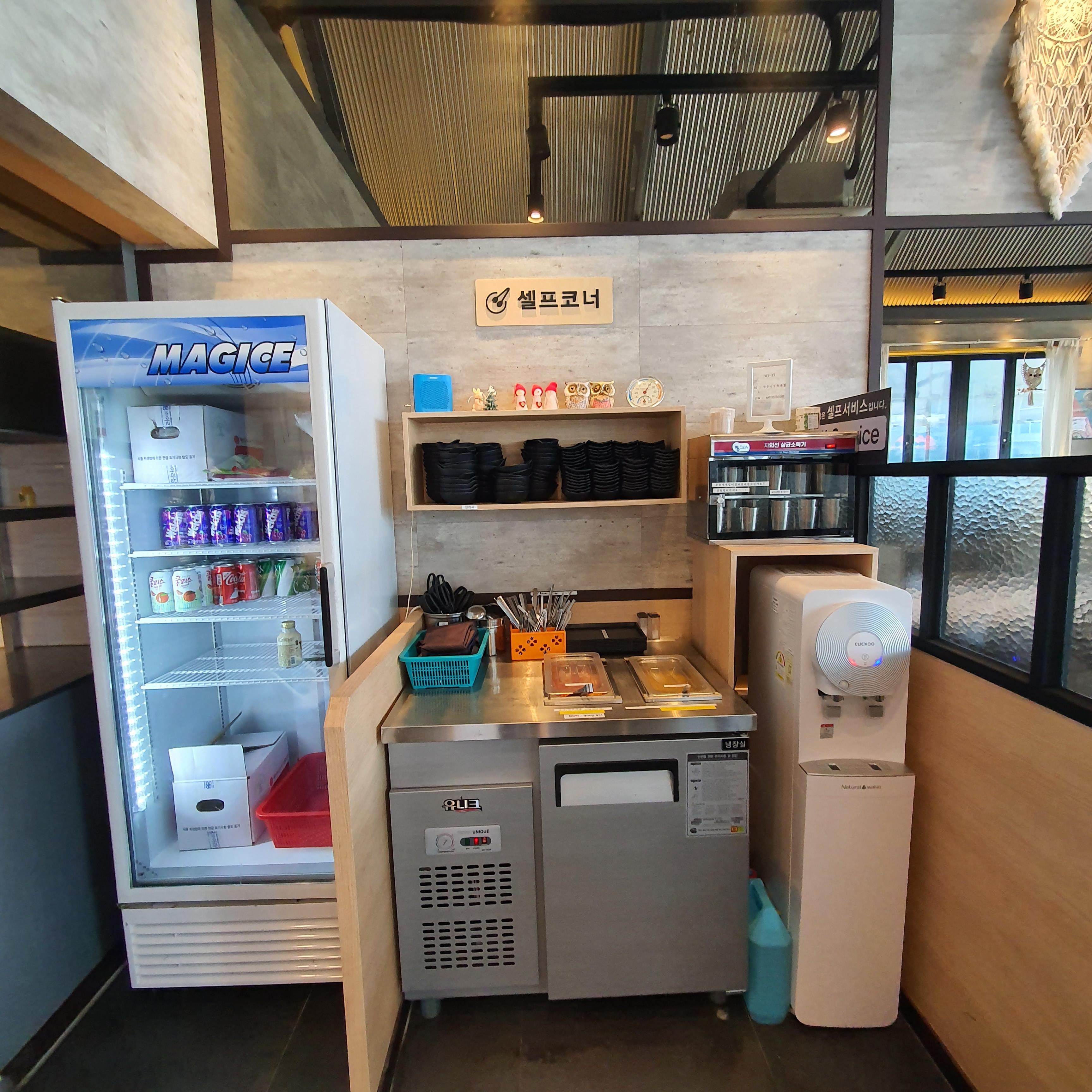 모든 시스템이 셀프이기 때문에 주방옆쪽 셀프코너에서 필요한 물과, 집기, 앞접시등을 가져가면 된다.