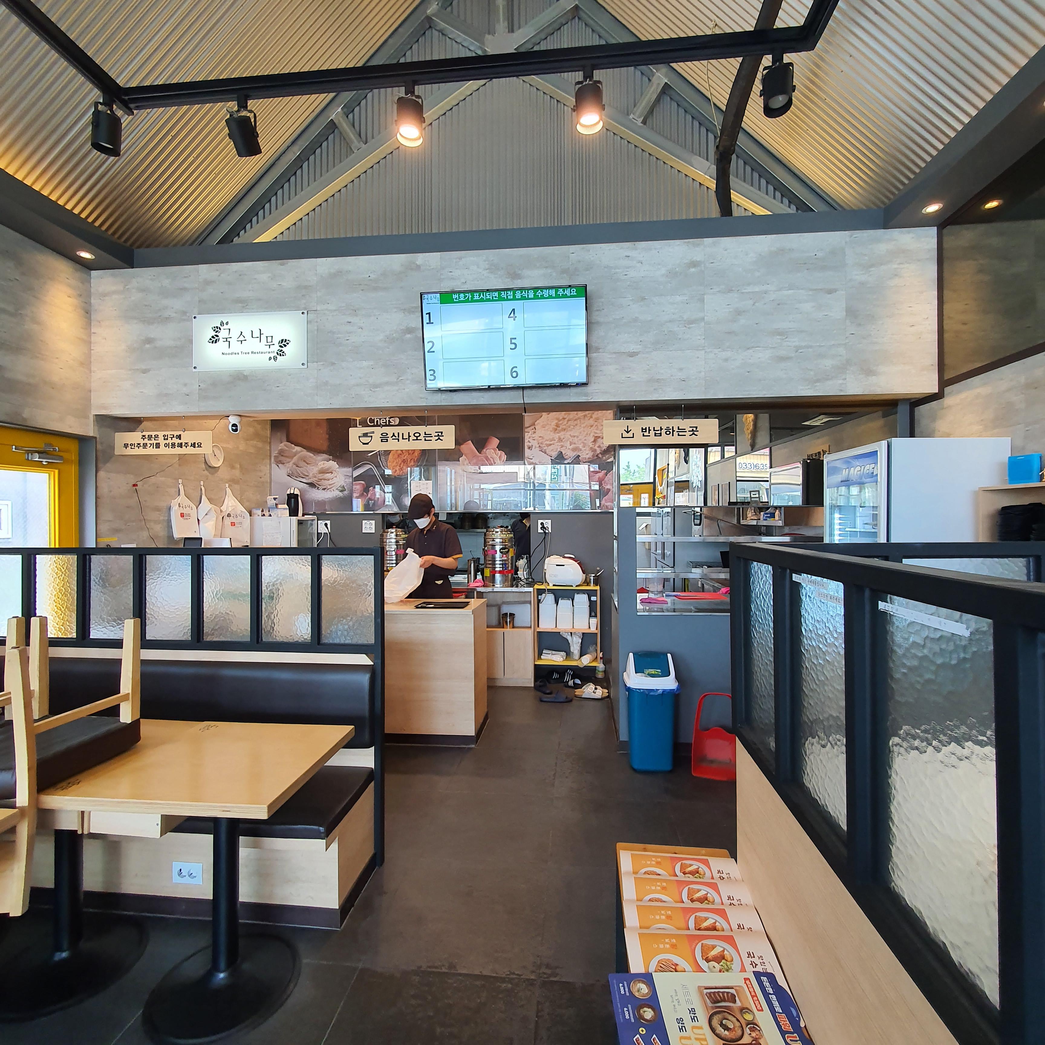 내부는 하나의 홀로 되어있고 입구 반대편에 주방과 음식을 받는곳, 반납하는 곳이 있다.
