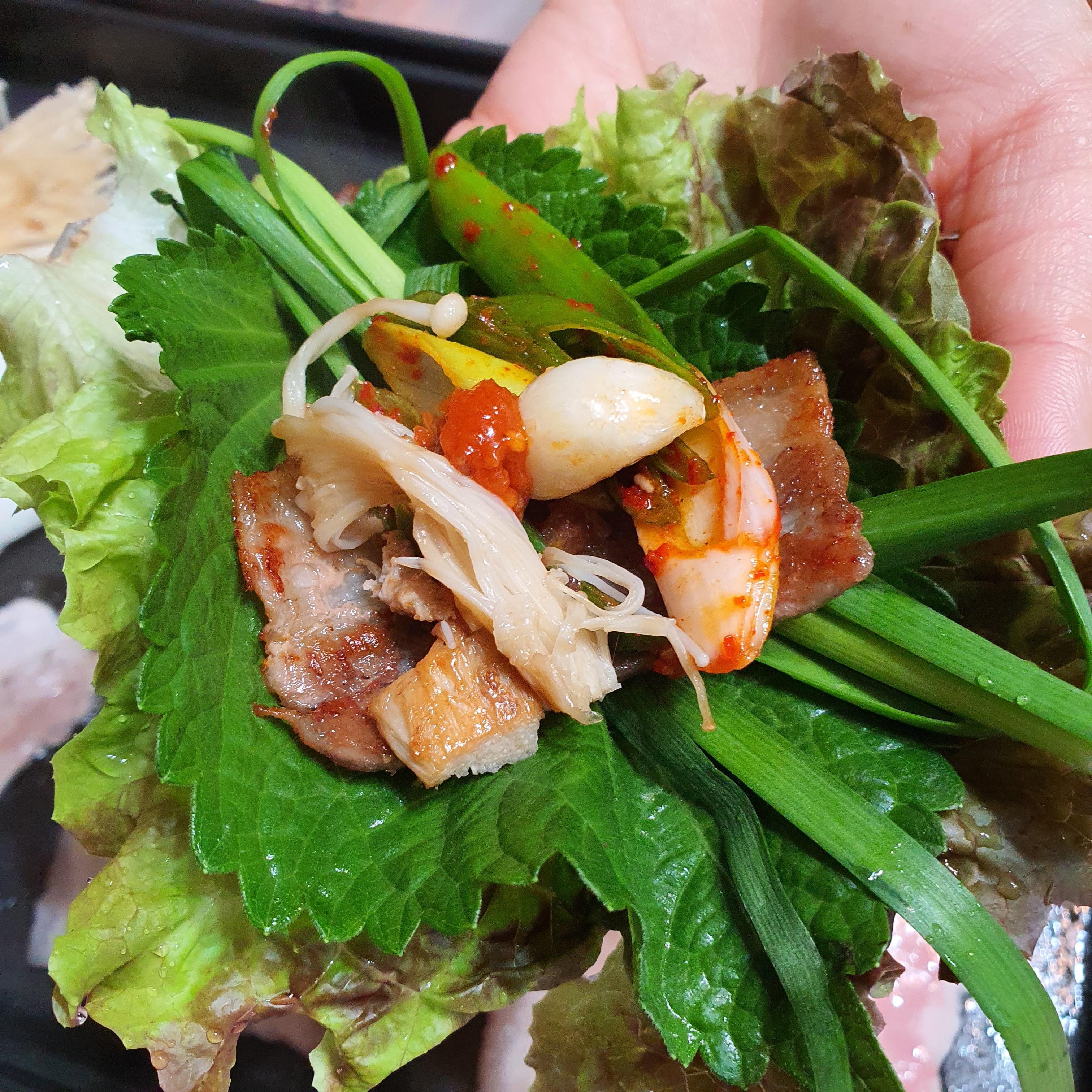 정육점에서 사 온 상추와 깻잎을 흐르는 물에 꼼꼼히 씻고 마늘과 양파, 팽이버섯을 준비한다.