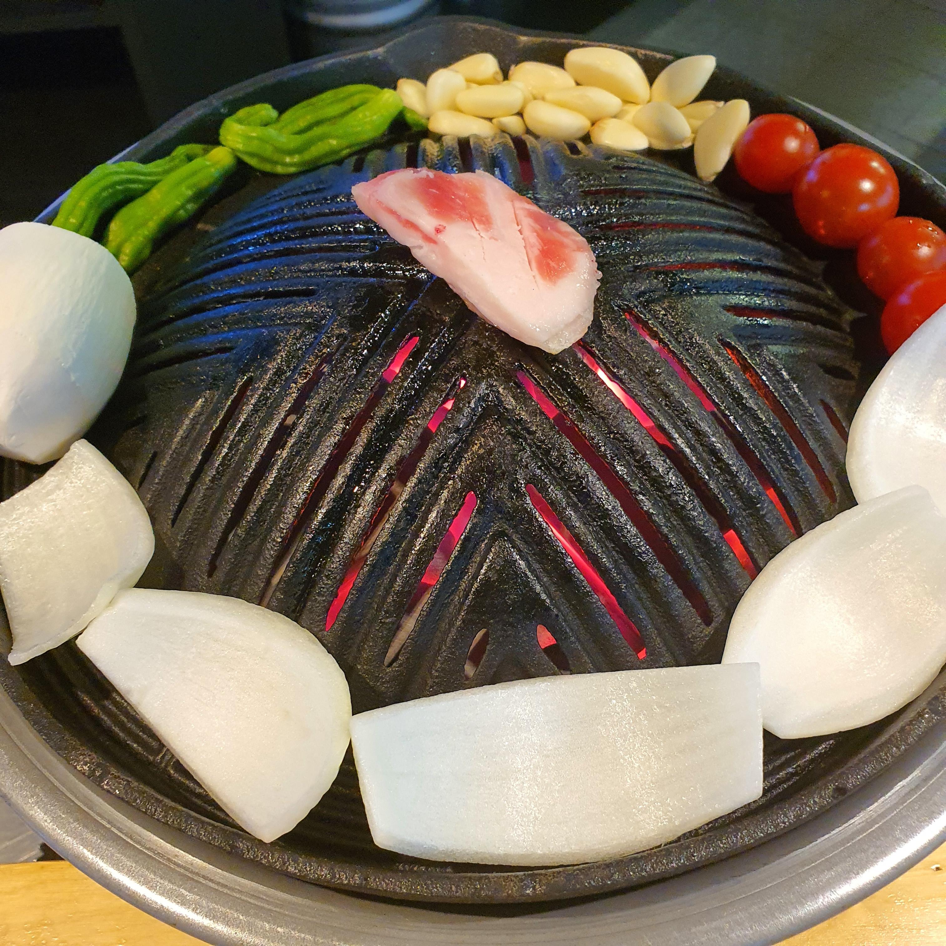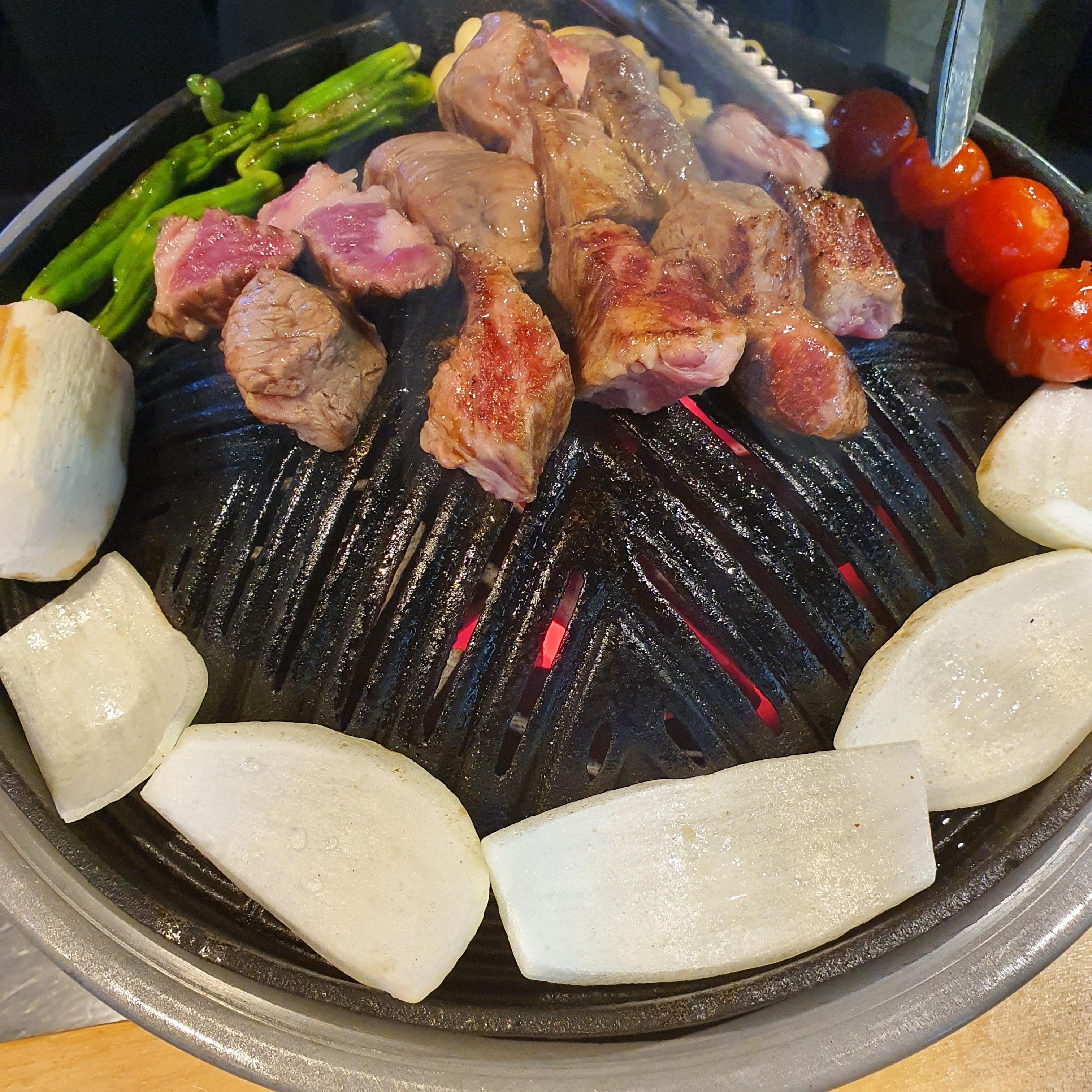 본격적으로 양갈비를 굽기전에 직원분께서 꽈리고추와 마늘, 토마토, 버섯, 양파를 먼저 불판에 올려주신다.