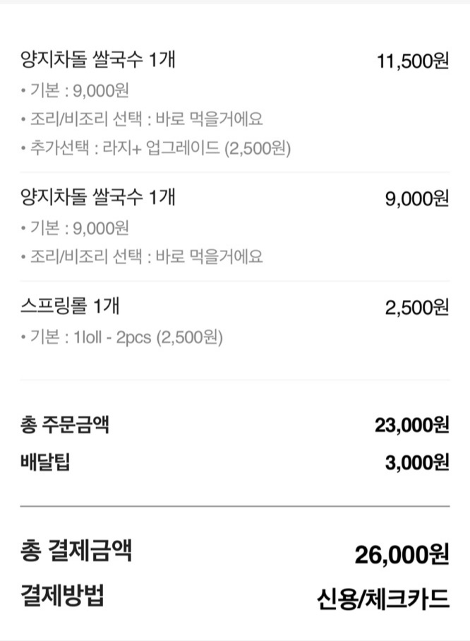 배달의 민족에서 주문을 했고 중딩1년차 아들과 함께 세명이 먹을것이라 하나는 곱배기 하나는 보통을 주문하고 사이드메뉴로 스프링롤을 주문하였다.