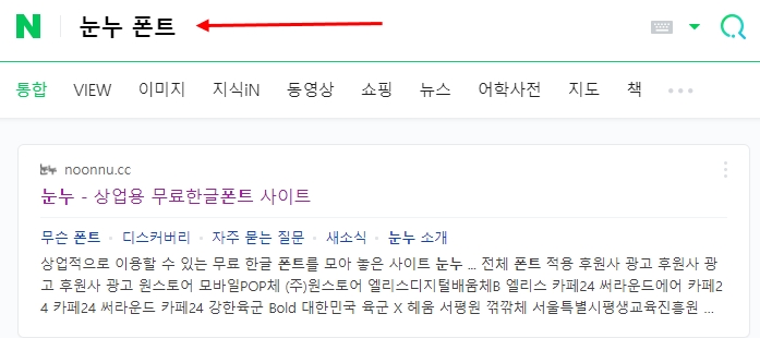 우선 검색창에 무료 폰트 사이트인 눈누 폰트를 검색한 후 나오는 눈누 무료 한글 폰트 사이트에 접속합니다.