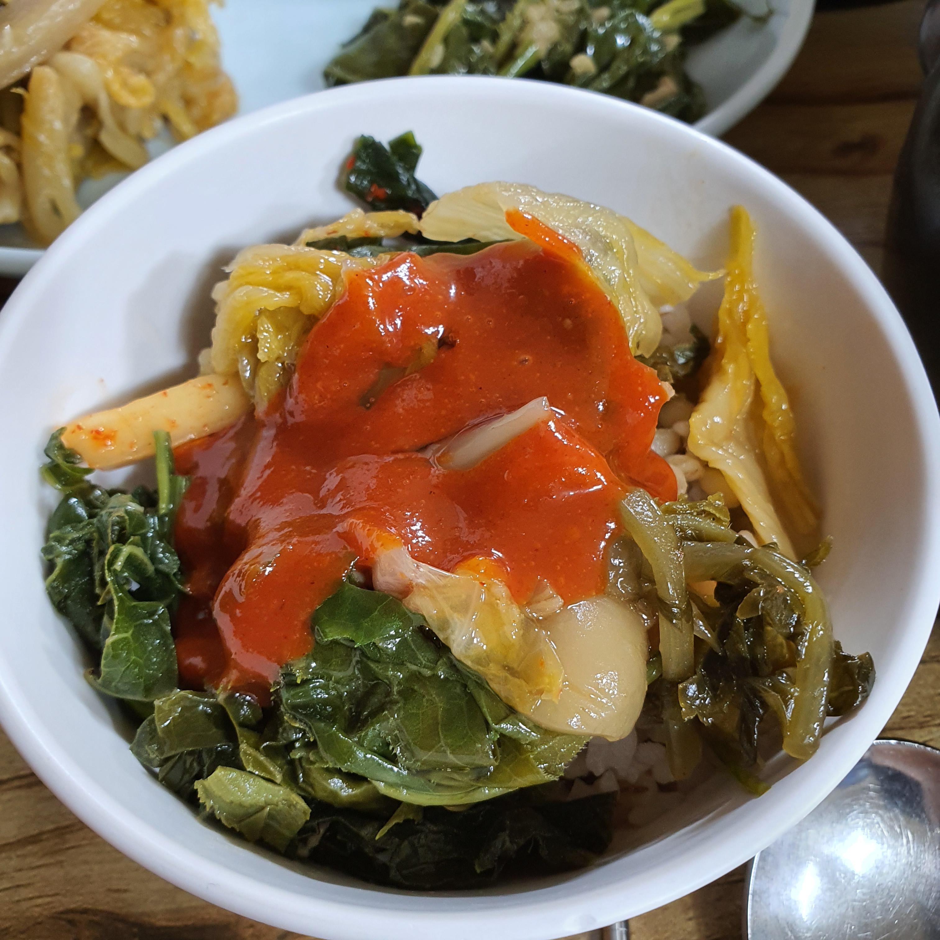 보리밥 위에 김치, 나물을 넣고 노란 통의 들기름과 빨간 통의 고추장을 넣어서 비벼 먹으면 고소하고 입안에 감칠맛이 돈다.