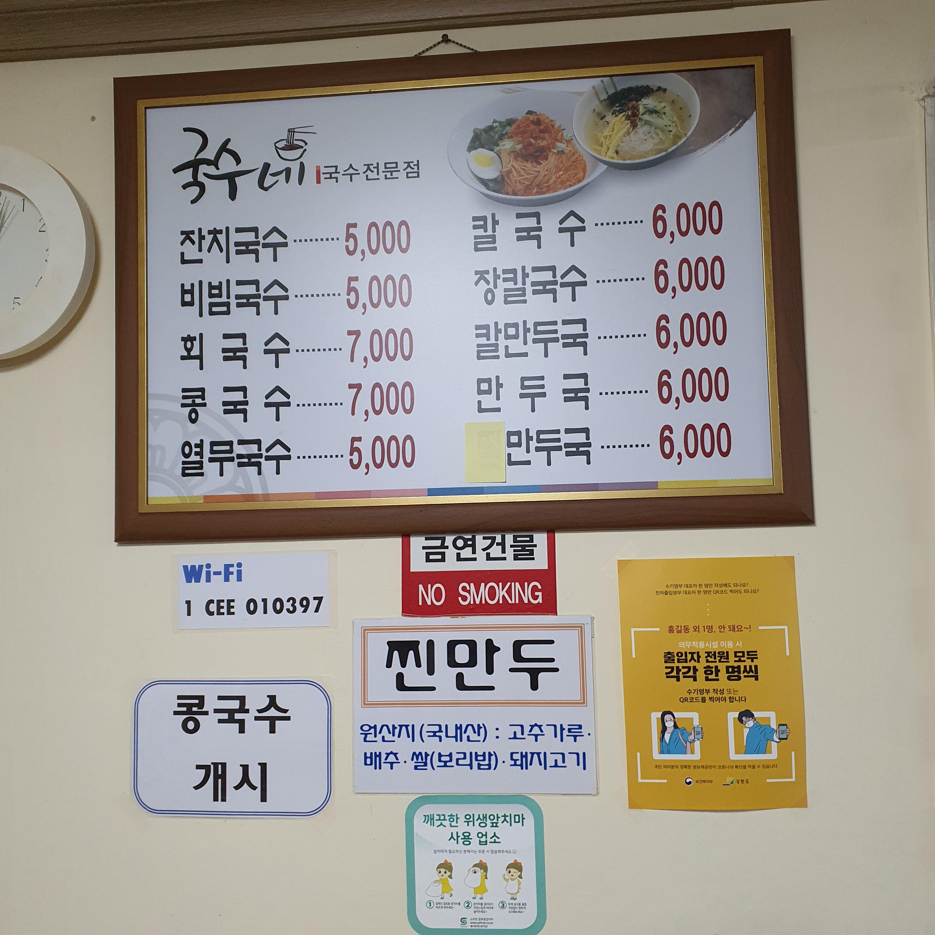메뉴는 국수 전문점답게 국수 종류가 많고 만둣국과 회 무침, 주류, 음료 등이 있다.