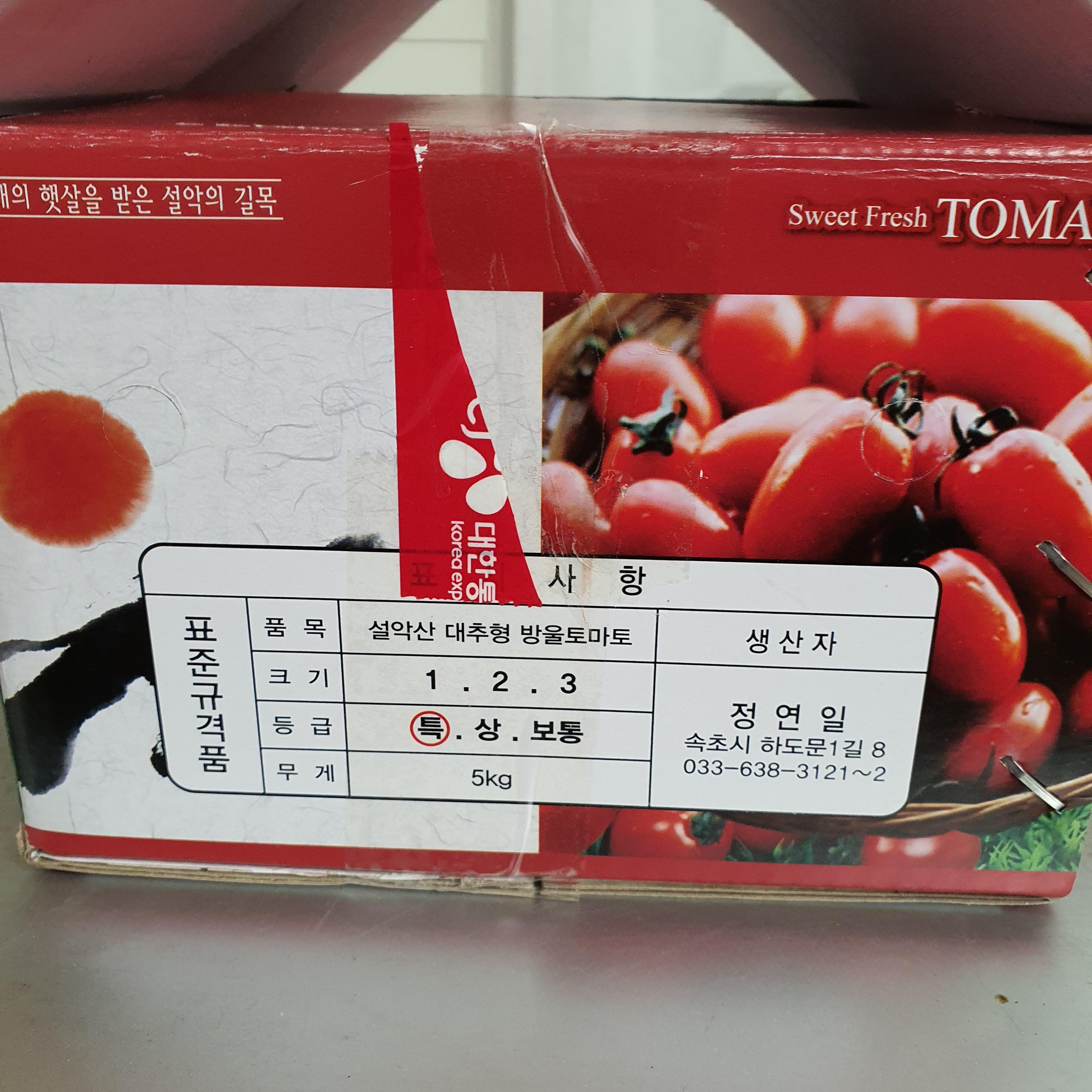 오늘 우리가 고른 방울토마토는 꼭지가 떨어진 빨강이(특 5kg) 방울토마토였으며 가격은 20,000원이었다.
